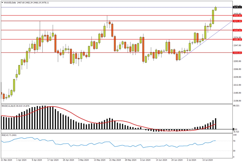 周初以来,黄金价格直奔新纪录,周二(7月16日)以一根中阳脆破4月及5月创下的两道纪录前高,并首次站上2470!
