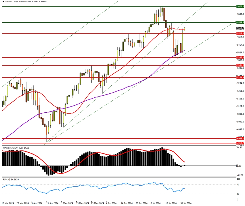 另外,经历过回调至60天均线并得到支持反弹的标普500,目前距离历史高点又只差近100点。标普维持虽然早前跌破了自4月中旬以来形成的上涨趋势线,但在60均线得到支持后反弹;目前如能进一步挑战5600水平,也就是形成一浪高于一浪形态,将有望再创历史新高;下方支持在5530、5395水平。