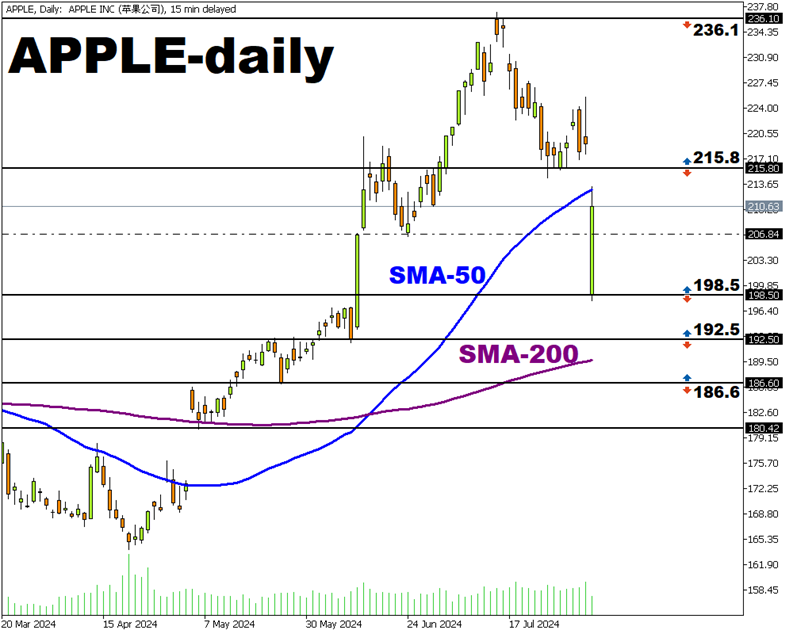 苹果股价近日震荡于236高点和215.8低点之间,周一开盘向下跳空至198.5,盘中有所回升。