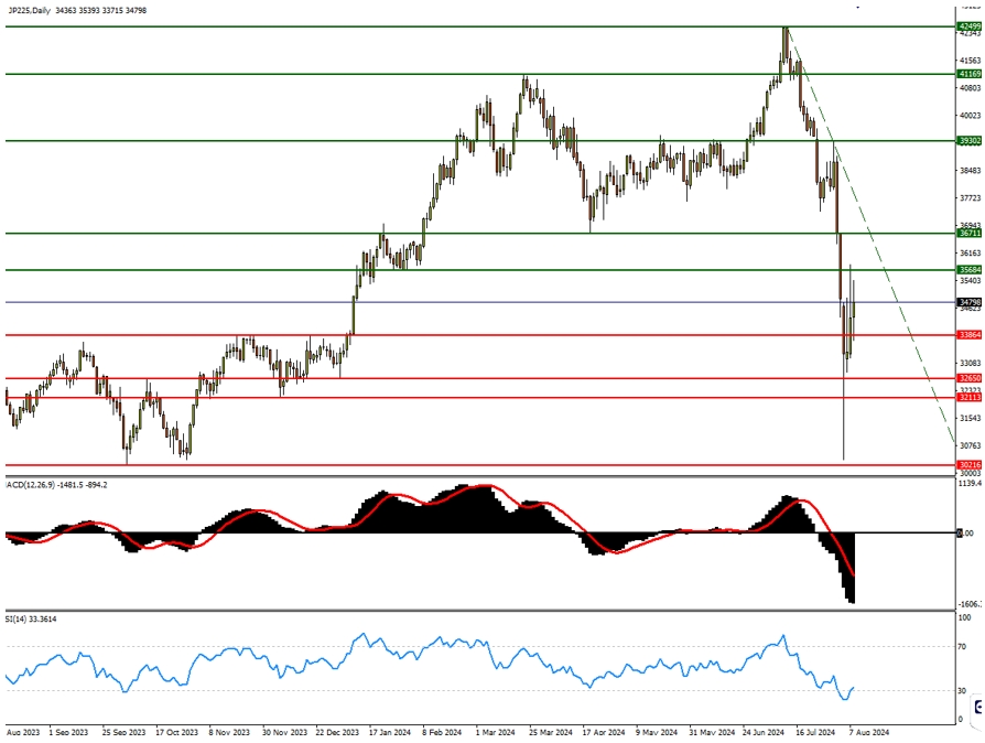 然而,目前日经指数自4万大关回落已形成了下行趋势线,上方有形成类似M字下行形态,上方关键阻力在36700水平,短期内如未能进一步突破36700、37500水平,日经指数在反弹后或再次跌向3万大关整固。