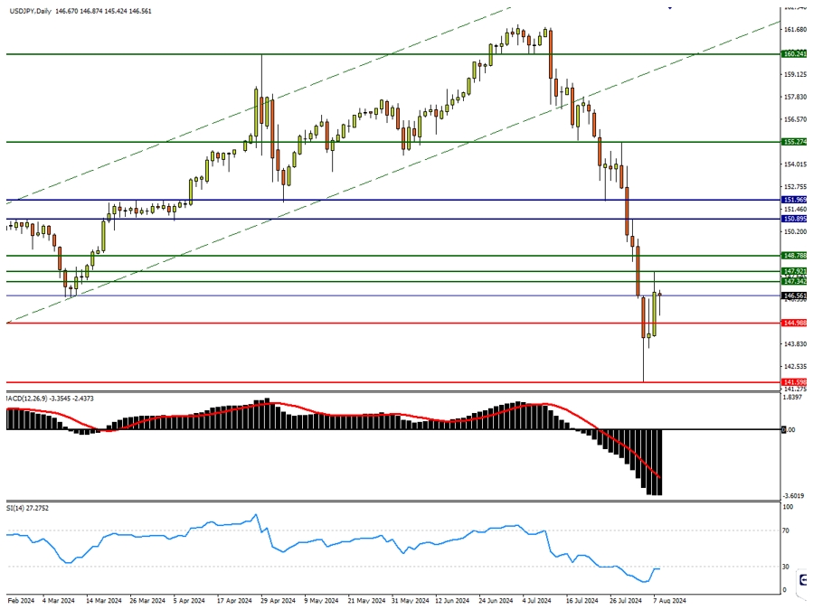 日线图看,上方目前阻力在147.35、147.90、148.80水平和关键的150-152区间,上方遇阻后美元/日元有望再次回落。