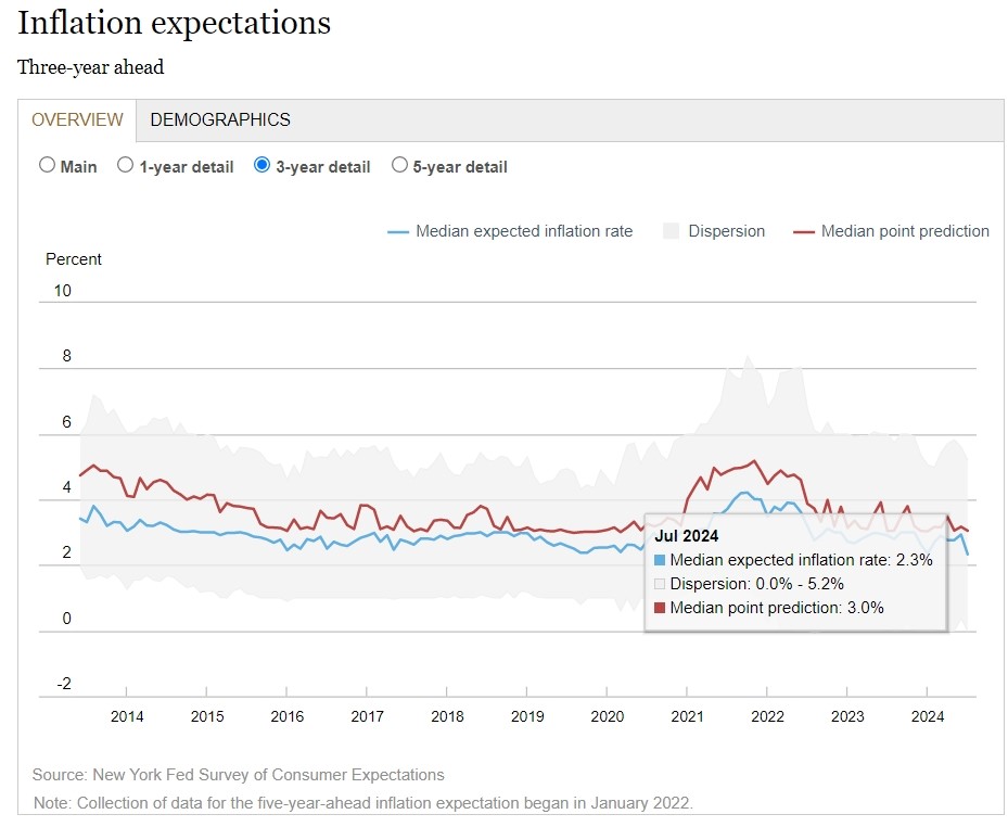 2.3%的预期涨幅相比6月显著下降0.6个百分点,是该调查自2013年6月开始统计以来的最低水平。