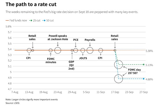 而在未来几周,待公布的美国的就业、通胀、消费者支出和GDP增长等数据,也都有可能影响美联储的9月决策:到底是降息25基点,还是会祭出更大的行动力度。