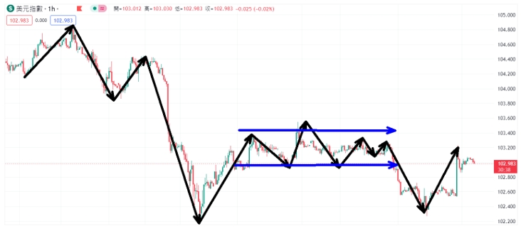 另外,技术分析面切入1小时级别观察美元指数受到经济数据利多影响出现一波跌深反弹行情,目前K棒冲高后来到上方压力区间,短线若突破压力区间失败,则有望再度转跌挑战下方波段低点。