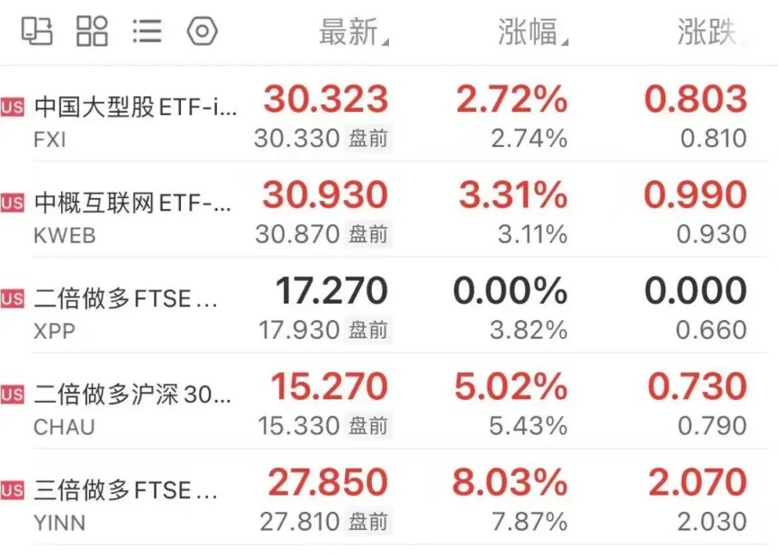 27日晚,美股开盘后,中国资产全线走强,截至北京时间23:00,纳斯达克中国金龙指数大涨2.86%,富时中国3倍做多ETF大涨超8%,2倍做多中国互联网股票ETF-Direxion涨6.9%,中国科技指数ETF涨4.5%。