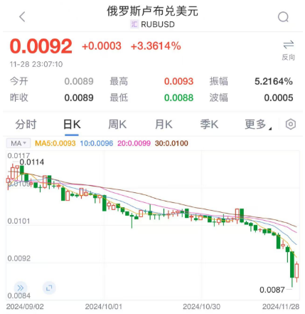 11月27日,俄罗斯卢布出现恐慌性抛售,卢布兑美元汇率盘中一度跌超8.5%。截至27日的一周,俄罗斯汇率暴跌10%,创2022年3月以来的最低纪录。