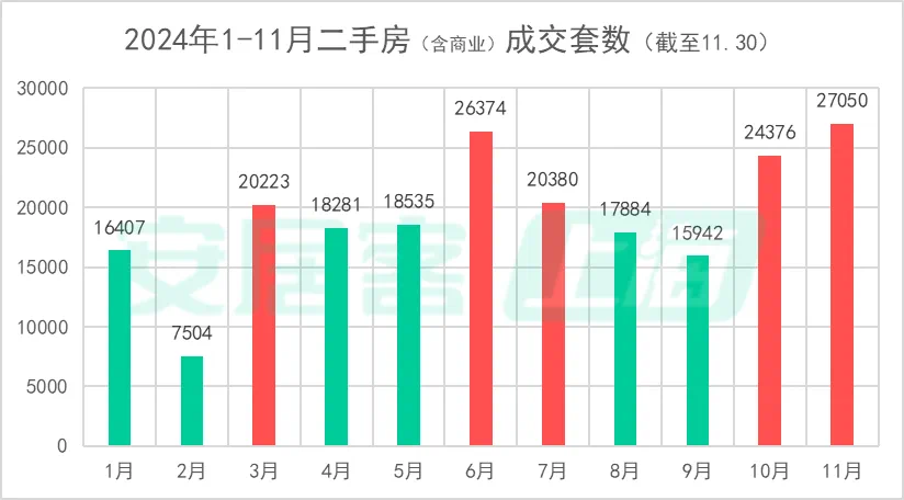 据安居客上海监测数据,11月,上海二手房(含商业)累计成交27050套,不仅超越6月成为全年二手房成交量最高的月份,也是自2021年3月以来首次突破27000套大关,创下近44个月以来的最高成交量。