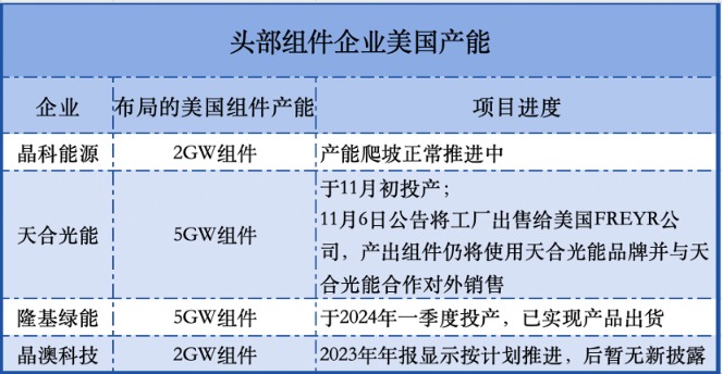 为了加强本地化,多家龙头组件企业此前均已启动赴美建厂。贝壳财经记者关注到,晶科能源、天合光能与隆基绿能的美国组件产能均已宣布投产。