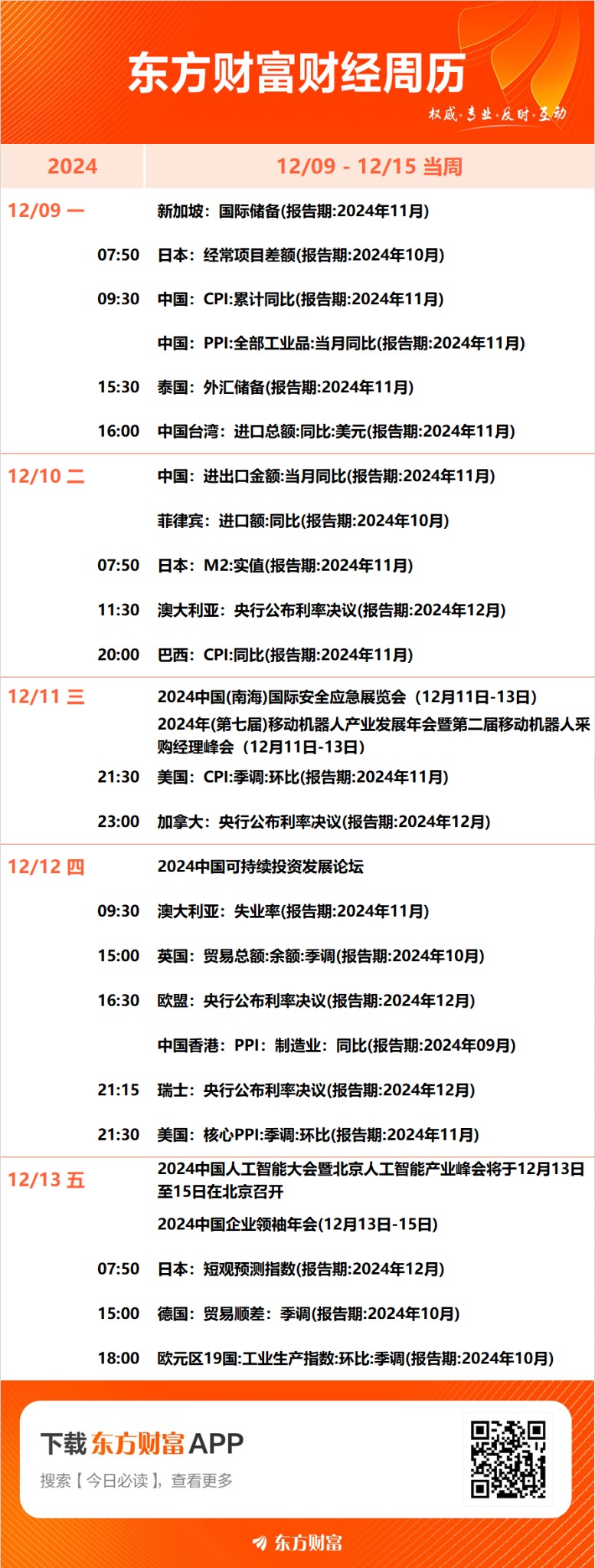 下周重磅日程:12月9日至12月15日当周重磅财经事件一览