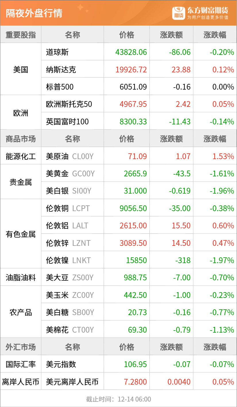 豆粕:据上海钢联(Mysteel)农产品团队统计,12月13日全国主要油厂豆粕成交24.27万吨,较前一交易日减少0.08万吨,其中现货成交11.41万吨,远月基差成交12.86万吨。当日全国动态全样本油厂开机率上升至56.58%。(Mysteel)