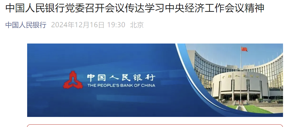 据央行官微,12月16日,中国人民银行党委召开会议,传达学习中央经济工作会议精神,按照全国金融系统工作会议部署,研究明确贯彻落实举措。中国人民银行党委书记、行长潘功胜主持会议,各党委成员出席会议。