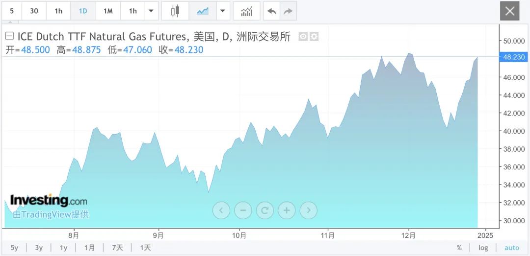 与此同时,欧洲天然气交易基准荷兰TTF天然气期货价格也连续大涨,上周五一度大涨超5%,现已接近前期新高。