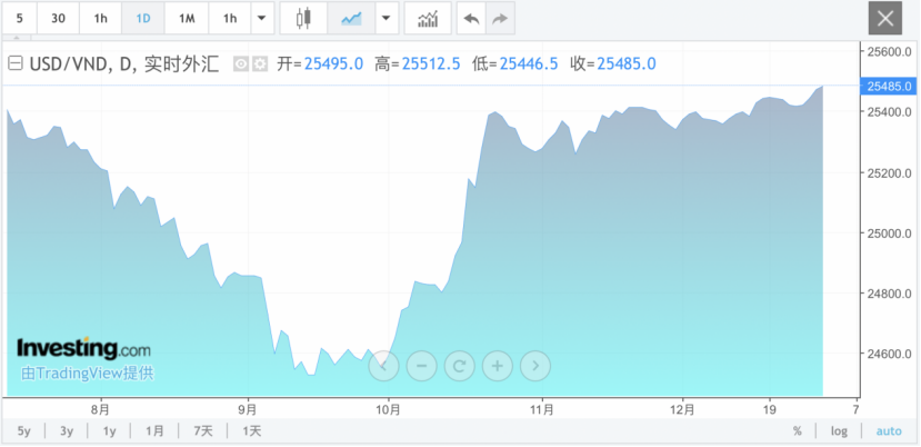 TVI(越南河内股票研究与投资公司)首席执行官Tran Tuan Minh指出,特朗普即将正式就职,市场对美元需求因此增加。此外,每逢年底,越南企业需要更多美元支付合同,预计越南盾可能会进一步走弱。