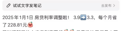 以泰勒为例,房贷利率定价日为每年的1月1日,2024年初的房贷利率为LPR,即4.2%,去年10月份批量调整存量房贷利率后,利率降为3.9%(4.2%-30BP),2025年1月1日之后就可以兑现去年的LPR降息利好,即房贷利率从“4.2%-30BP”变成“3.6%-30BP”来到了3.3%,降息幅度达到60个基点。