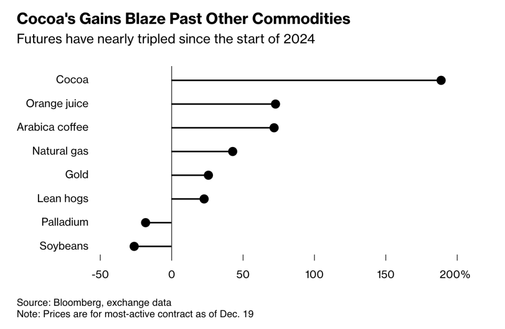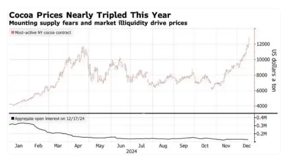 由于西非(世界上最大的粮食种植区)产量下降,导致大规模供应短缺,可可期货价格几乎上涨了两倍。2024年12月18日,纽约可可期货价格创下历史新高,飙升至每吨近1.3万美元的历史高位。