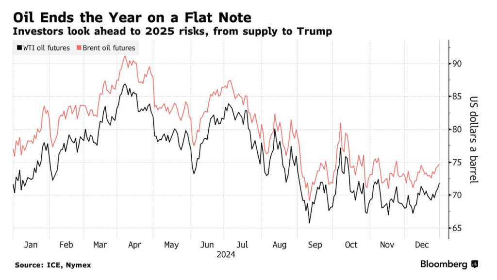 2024年12月31日,布伦特原油期货收涨0.88%,至每桶74.64美元,较2023年77.04美元的最终收盘价下跌了约3%;WTI原油期货收涨1.03%,至每桶71.72美元,与2023年最终收盘价基本持平。