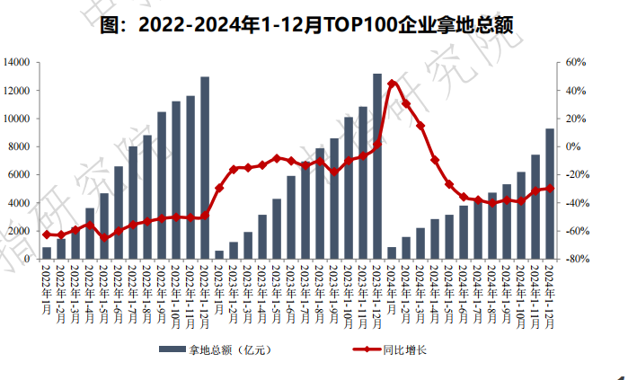 2024年10月以来,上海、深圳、杭州、成都等热点城市土拍市场持续活跃,接连出让多宗高总价地块,带动房地产百强企业2024年全年拿地总额同比降幅收窄。