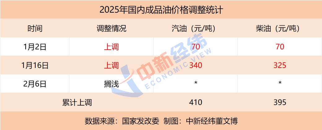 今年以来,国内油价已经历三轮调整,分别为“两涨一搁浅”。调价后,国内汽、柴油价格每吨较去年底分别上涨410元、395元。若本轮调整落地,2025年调价格局将变为“两涨一跌一搁浅”。