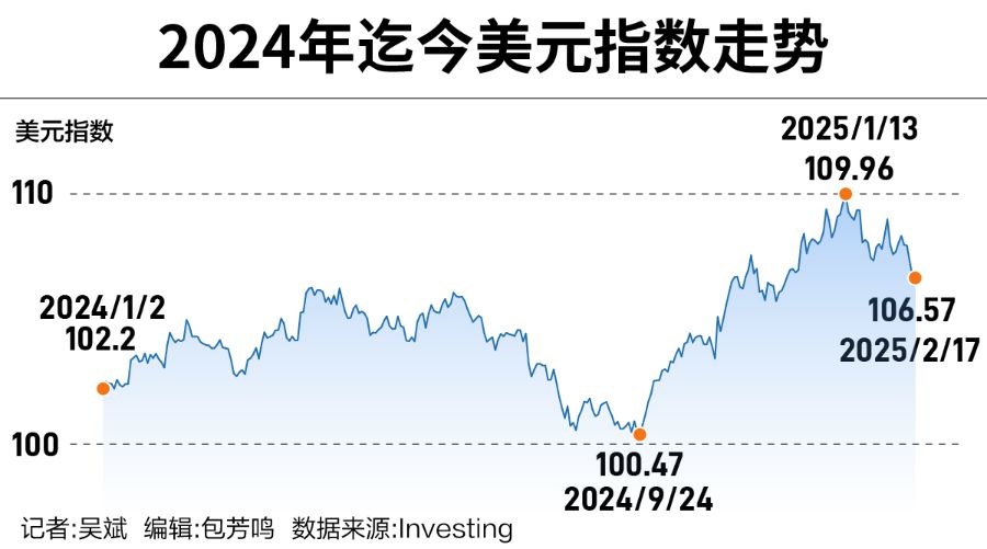 去年四季度,由于市场押注美国总统特朗普的政策将加剧通胀压力,压缩美联储降息空间,并抑制美国贸易伙伴的经济增长,这推动了美元大幅走高。从去年9月底到年底,美元指数大涨约8%。