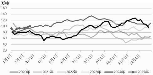 自去年 10 月中旬起,受天然气紧缺等因素影响,伊朗装置逐步停车。截至今年 1月初,伊朗装置基本全部停车,仅余2套装置维持运行。我国甲醇进口量随之逐渐下滑,从2024年12月的115万吨降至2025年1月的90万吨,而 2 月进口量预计将进一步降至55万—60万吨。目前3月进口量尚未确定,从外盘装置发船情况来看,伊朗 2 月上旬发船11万吨。若2月中下旬装置恢复速度较快,全月发船量预计可达40万吨;非伊朗装置月度正常发船量预计维持在45万吨左右。不过,近期欧洲装置重启较多,供应存在增量,预计发船量将上升至 50万吨。据此,3月我国进口量乐观预期为90万吨。但据进口商消息,伊朗装置恢复预计较慢,同时甲醇运输船只尚未回航伊朗,2月伊朗发船量预计依旧偏低。综合来看,3月进口量预计在75万—85 万吨之间,低于市场预期。