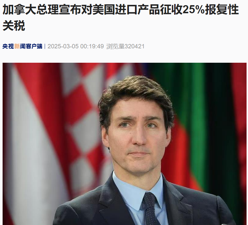 据央视新闻3月5日消息,当地时间3月4日,加拿大总理特鲁多宣布,对从美国进口的产品征收25%的报复性关税。