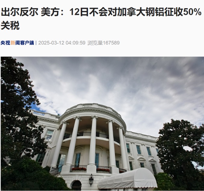 据央视新闻3月12日消息,当地时间3月11日,美国白宫贸易顾问纳瓦罗表示,12日不会对加拿大钢铝产品征收50%的关税。