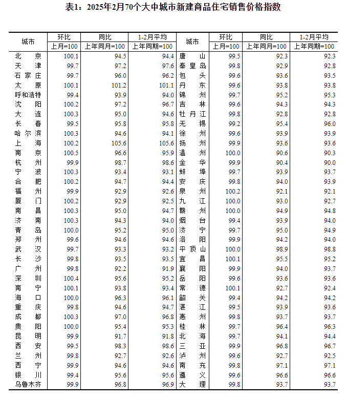 2025年2月份,从环比看,受春节销售淡季等因素影响,70个大中城市中,各线城市商品住宅销售价格总体稳中略降,其中一线城市新建商品住宅销售价格上涨。从同比看,各线城市商品住宅销售价格降幅均继续收窄。