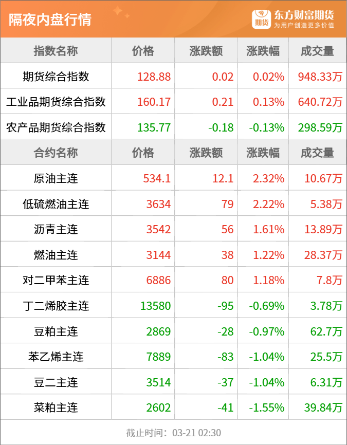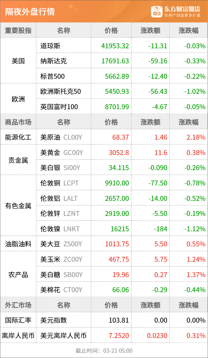 螺纹钢:据Mysteel,截至3月20日当周,螺纹钢表需连续第五周增加,厂库连续第四周减少,社库连续第二周减少,产量由增转减。螺纹产量226.21万吨,较上周减少0.89万吨,降幅0.39%;螺纹厂库219.04万吨,较上周减少6.74万吨,降幅2.99%;螺纹社库617.96万吨,较上周减少10.04万吨,降幅1.60%;螺纹表需242.99万吨,较上周增加9.77万吨,增幅4.19%。(我的钢铁网)