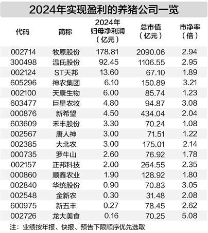 以预告金额下限统计,牧原股份、温氏股份两大行业龙头公司分别盈利178.81亿元、92.45亿元,ST天邦预告盈利13.6亿元,神农集团、天康生物预告盈利超6亿元。