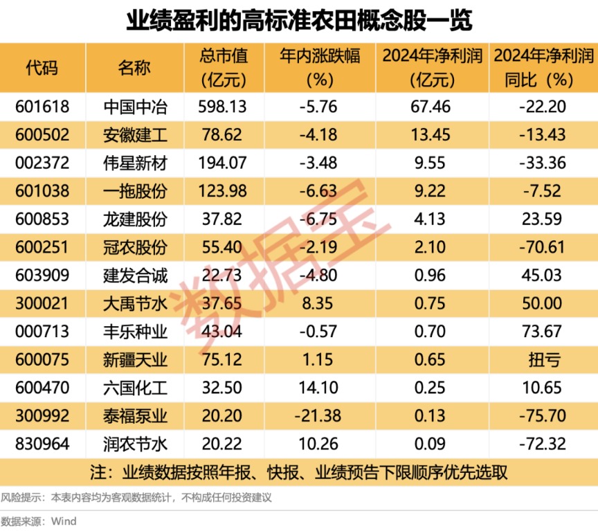 业绩方面,结合年报、快报、业绩预告下限数据来看,19只已发布相关数据的高标准农田概念股中有13只概念股2024年业绩盈利。