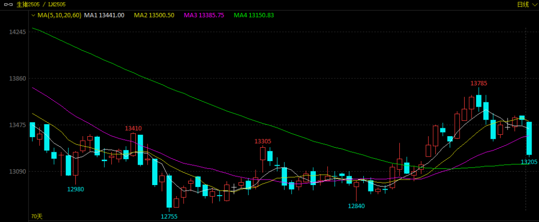 上周,生猪期货价格先扬后抑,主力合约2505在周五下跌超2%,盘中最低跌至13205元/吨,创近三周最低。