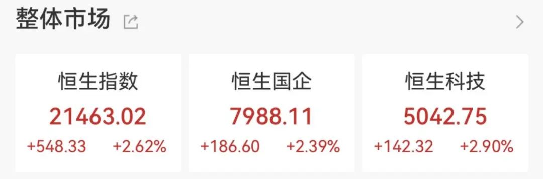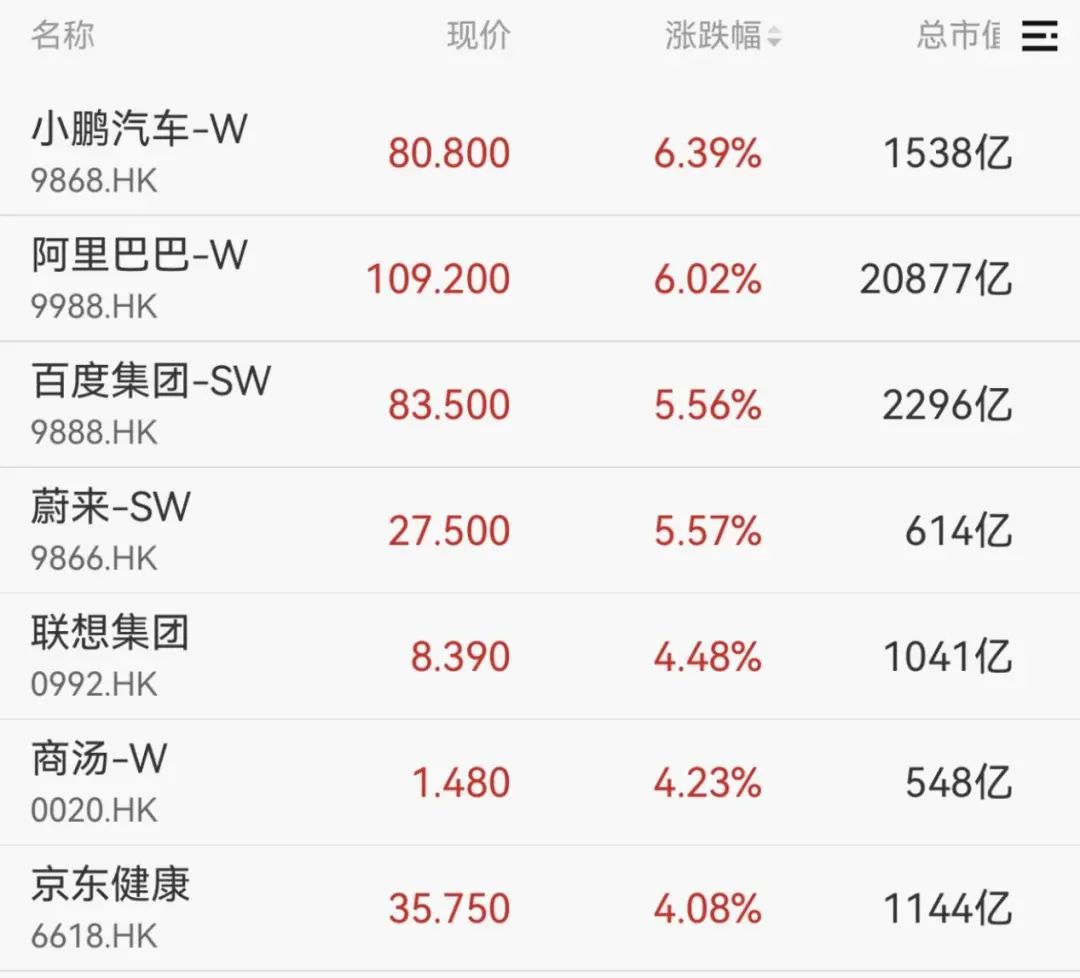 港股方面,三大指数均涨超2%,恒生科技指数领涨,小鹏汽车、阿里巴巴、百度集团、蔚来均涨超5%。