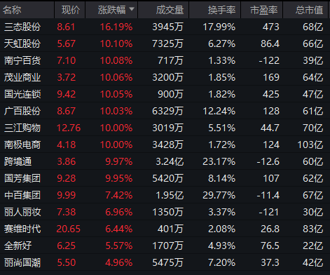 此外,大消费板块盘中走强,零售、首发经济、餐饮旅游等板块震荡拉升,天虹股份、南宁百货、茂业商业等多股涨停。