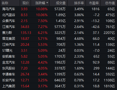 汽车整车股震荡走高,海马汽车、北汽蓝谷涨停,众泰汽车、江淮汽车、赛力斯等涨超5%。