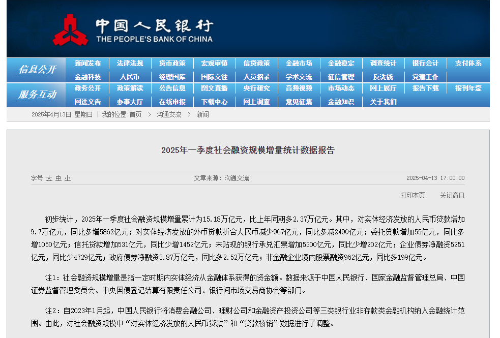 社会融资规模方面,2025年一季度社会融资规模增量累计为15.18万亿元,比上年同期多2.37万亿元。