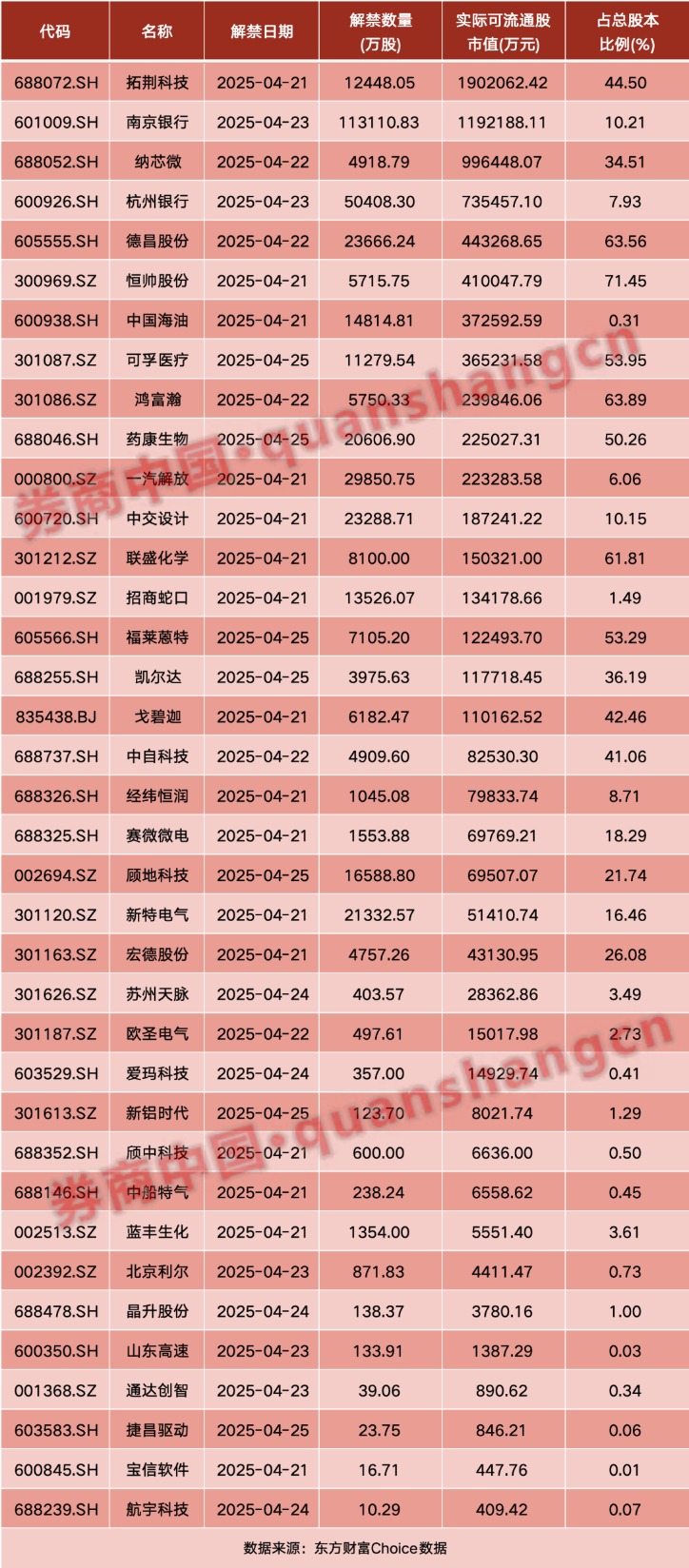数据显示,本周(4月21日—4月25日)共有37家公司限售股陆续解禁,合计解禁量40.97亿股,按4月18日收盘价计算,解禁市值为842.1亿元。
