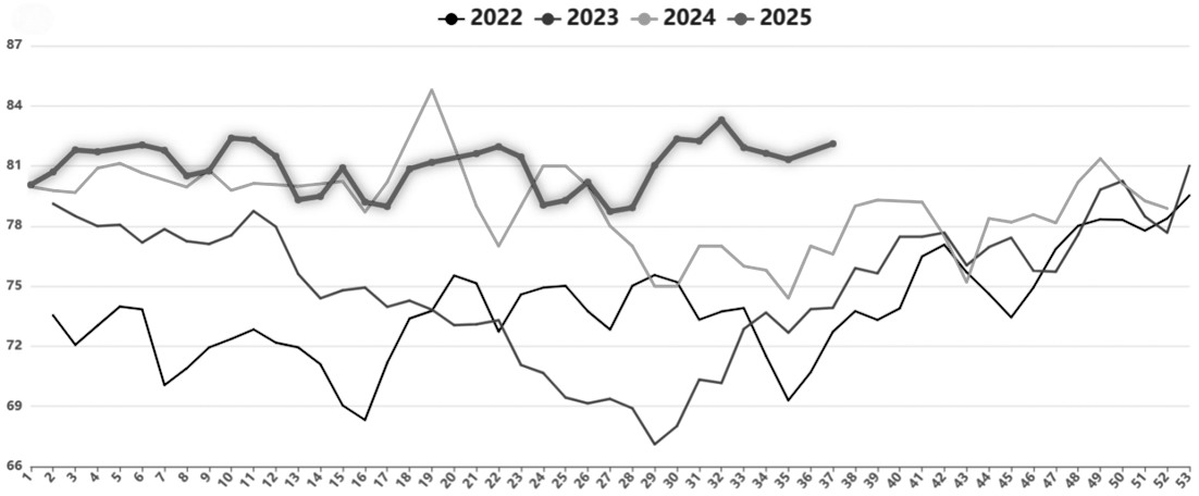 随着前期检修装置恢复生产,烧碱供应压力逐步增加。根据隆众资讯数据,截至9月12日,国内烧碱周度产量为82.11万吨,继续保持近四年同期高位水平;20万吨及以上烧碱样本企业产能利用率为83.4%,未来装置检修计划逐步减少,产能利用率预计会进一步提升。