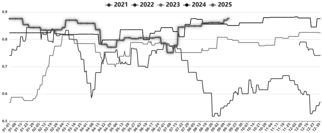 值得注意的是,9月初烧碱现货价格保持高位运行,基差也持续走强,但是9月中旬现货价格出现松动迹象,山东下游企业连续下调采购价格,市场看空情绪升温。截至9月16日,山东地区32%液碱出厂均价降至820元/吨,烧碱基差也由正转负,期货价格进一步承压。