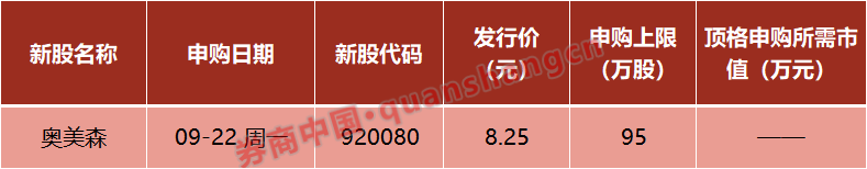 本周(9月22日—9月26日)有1只新股发行。周一:奥美森。