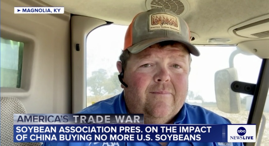 美国广播公司(ABC)当地时间19日播出一段对美国大豆协会主席凯莱布·拉格兰的现场直播采访。画面中,拉格兰坐在拖拉机上,再次提到目前美国大豆正值收获季,中国的订购量却为“零”。他向美国总统特朗普发出紧急呼吁:我们需要的是强大的市场和机遇,中国市场对我们的生计至关重要。