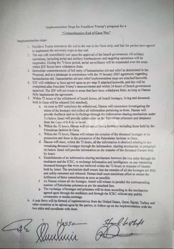 据央视新闻,当地时间10月9日夜间,以色列公共广播公司Kan发布了以色列、哈马斯和调解员在埃及签署的释放被扣押人员和结束加沙冲突的协议副本。这份文件详细介绍了该协议的各个部分。