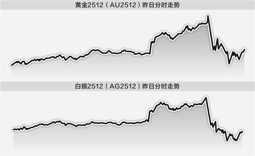 10月14日,上期所黄金、白银期货早盘走高,午后遭遇大幅调整,黄金期货一度跳水3%,白银期货波动更是超过6%。截至当日收盘,黄金期货主力AU2512合约收报938.98元/克,较前日结算价上涨2.7%;白银期货主力AG2512合约收报11533元/千克,涨幅为2.64%,两大品种均再创上市以来新高。