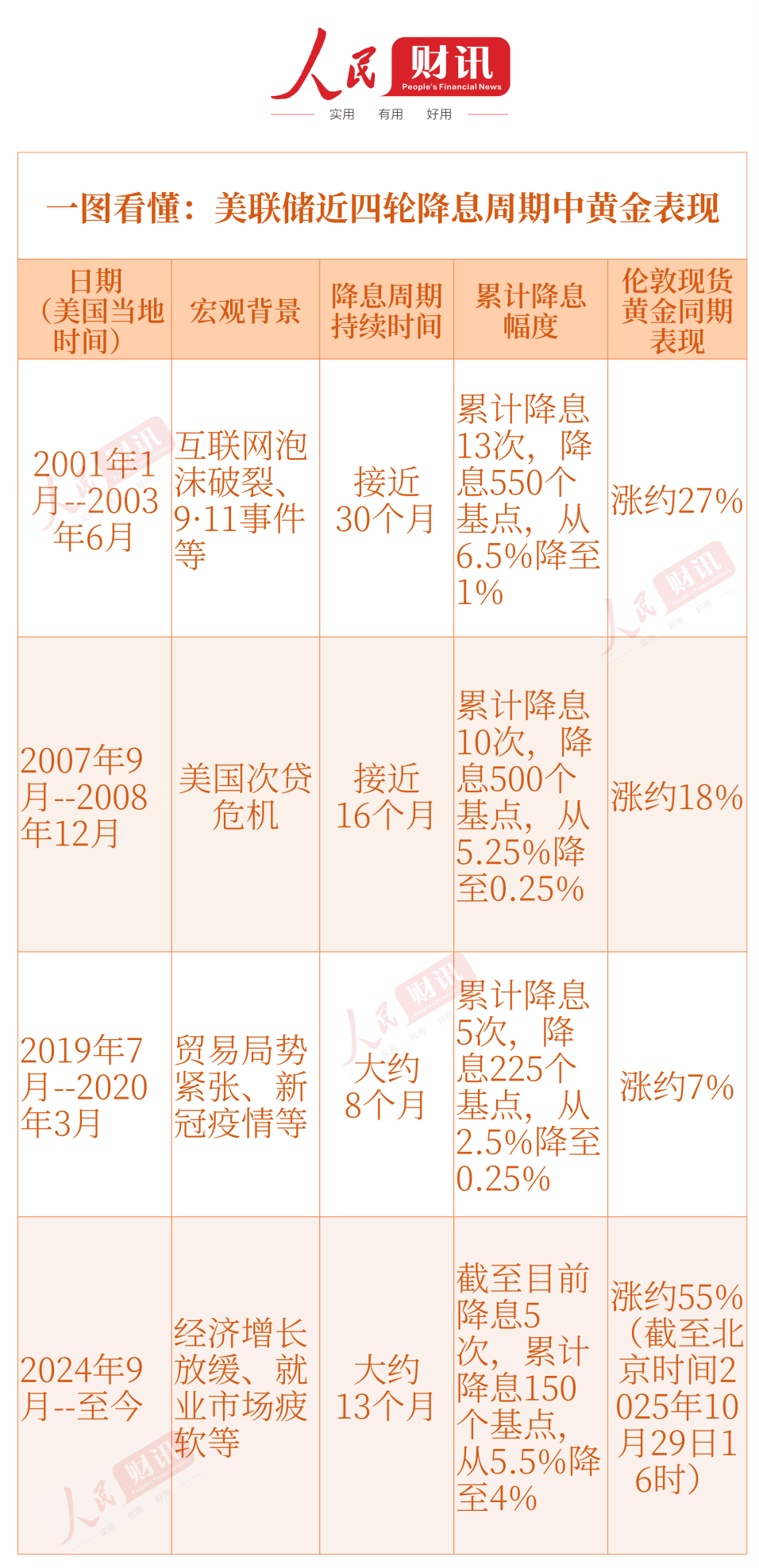 从2000年以来,美联储共经历了四轮降息周期。每一轮降息周期,黄金都有所上涨。其中,前三轮完整的降息周期中,美国经济均面临较大事件冲击;同时,降息周期持续时间较长的话,黄金上涨幅度也较大。最新一轮降息周期中,伦敦现货黄金涨幅已约55%(截至北京时间2025年10月29日16时),远大于前几轮降息周期时的涨幅。