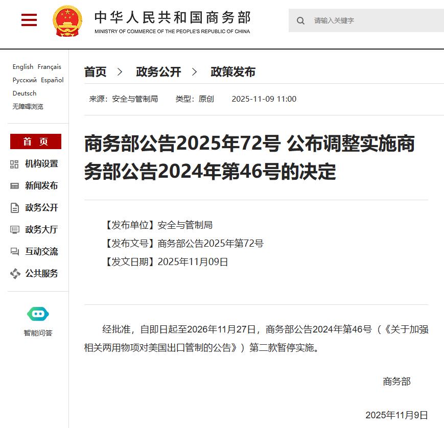 经批准,自即日起至2026年11月27日,商务部公告2024年第46号(《关于加强相关两用物项对美国出口管制的公告》)第二款暂停实施。
