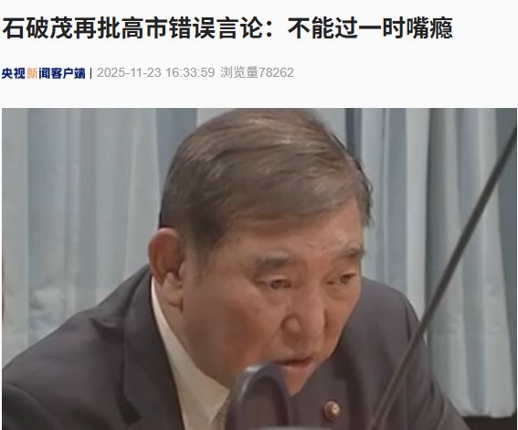 据央视新闻,针对日本首相高市早苗的涉台错误言论,日本前首相石破茂11月23日再次进行批评,他表示,牵涉到外交的问题上,不能过一时嘴瘾。希望高市内阁注意,不能在发言时只想着自己的支持率。