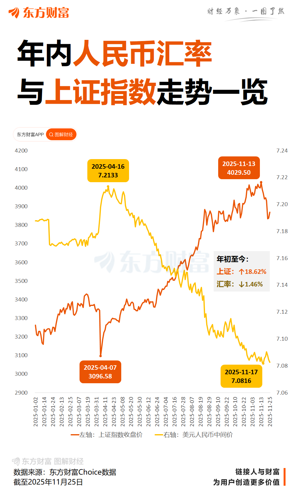 11月25日,离岸人民币、在岸人民币兑美元汇率均升破7.09关口,触及逾一年盘中新高。同日,中国人民银行授权中国外汇交易中心公布,当日银行间外汇市场人民币汇率中间价为1美元对人民币7.0826元,相较前一交易日中间价调升21个基点。今年以来,人民币中间价年内涨幅约1000个基点。