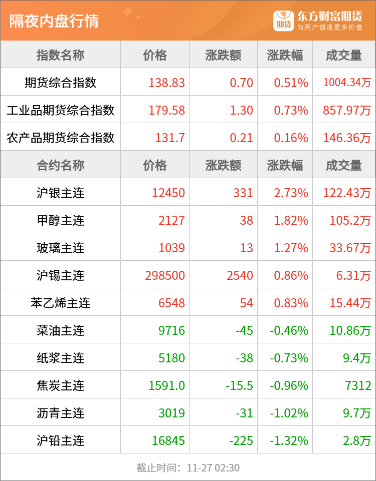 工业硅:11月26日,华东不通氧553#在9300-9400元/吨;通氧553#在9400-9600元/吨;521#在9600-9700元/吨;441#在9600-9800元/吨;421#在9600-9900元/吨;421#有机硅用在9800-10200元/吨;3303#在10300-10600元/吨。昆明、黄埔港、天津、西北、新疆、四川、上海地区硅价持稳。97硅今日价格同样持稳。(上海有色网)