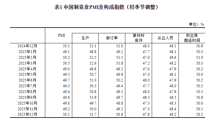 12月份,制造业采购经理指数(PMI)为50.1%,比上月上升0.9个百分点,升至扩张区间。