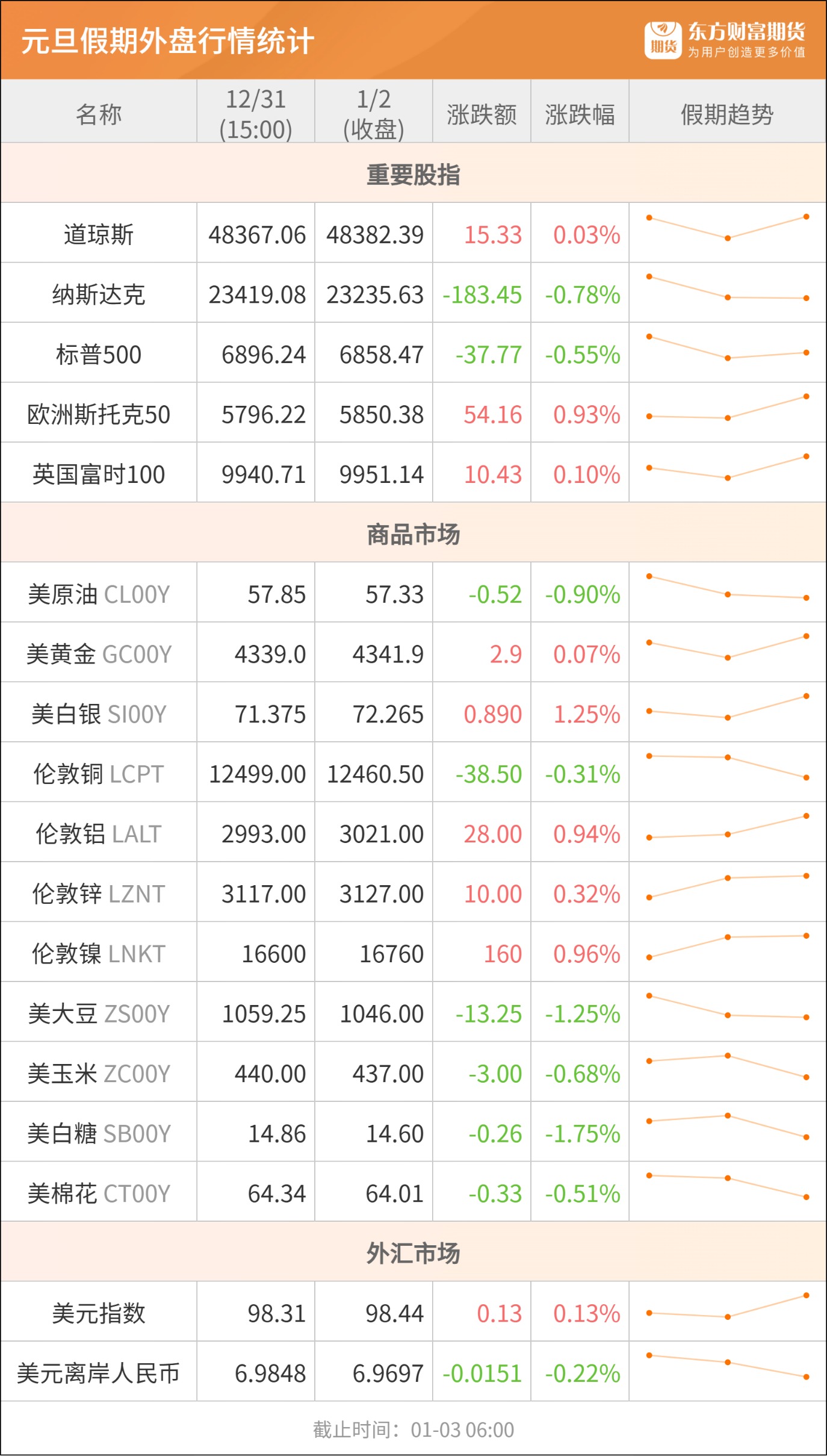 螺纹钢:截至2025年12月31日当周,螺纹钢产量连续三周增加,厂库由增转降,社库连续第十二周下降,表需连续二周下降,螺纹产量188.22万吨,较上周增加3.83万吨,增幅2.08%;螺纹厂库139.37万吨,较上周减少0.69万吨,减幅0.49%;螺纹社库282.66万吨,较上周减少11.53万吨,降幅3.92%;螺纹表需200.44万吨,较上周减少2.24万吨,降幅1.11%。(Mysteel)