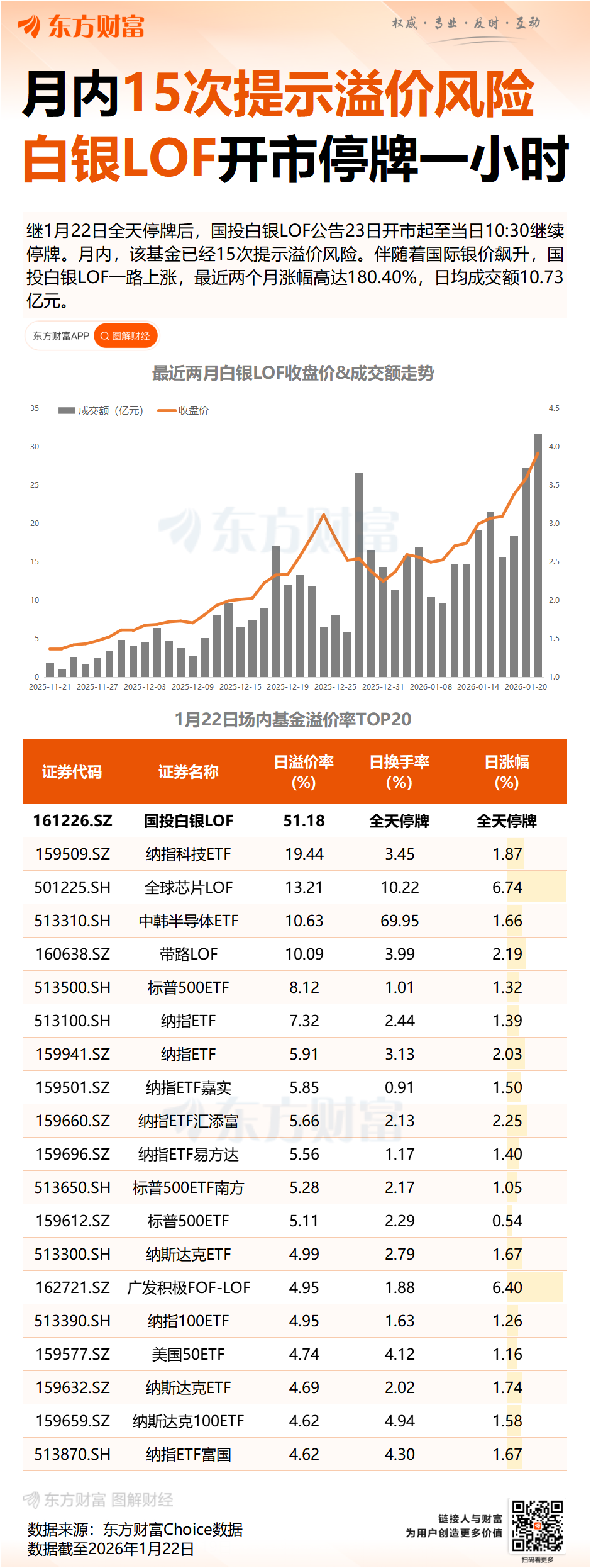 由于溢价率居高不下,在1月22日全天停牌后,国投白银LOF于1月22日晚间继续宣布暂停场内交易,将于2026年1月23日开市起至当日10:30停牌。